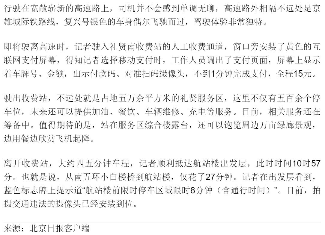 9月25日,《北京日報客戶端》在“去大興機場之高速路體驗:27分鐘,南五環直達航站樓”新聞報道中提到:“能“預報”行駛時間的標志牌,首次應用的主動發光交通標志,加裝了掃碼區的人工收費窗口,可遠程遙控的智慧路燈.......”,"與其它高速不同的是,大興機場高速會“報時”。沿線數十塊藍色的交通標志牌上,距離大興機場公里數下方的LED顯示屏上提示著所需時間。工作人員介紹,這些指路標志牌接入了地圖軟件的交通流量大數據,可為駕車市民提供“時間距離”參考。此外,這些指路牌本身也不簡單,在夜間或低能見度天氣條件下,可以自動開啟發光模式,不再需要借助車輛燈光照射,這種指路牌在北京是首次應用"。