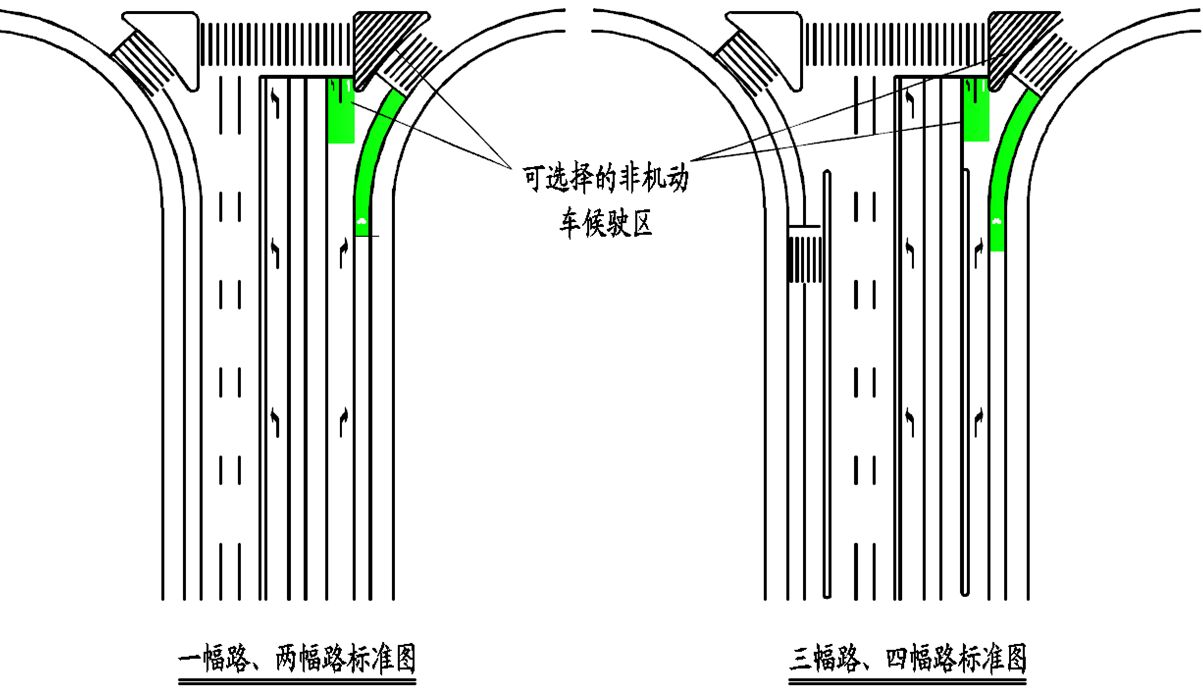 (2)三環外及三環內特殊路段:因大型貨車、客車通行需求較多,對車道寬度要求較高時,可對交叉口進口車道寬度適當進行增加;