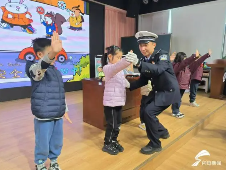“交警手勢,有模有樣。”民警進入課堂,為同學們展示交警指揮手勢。耐心糾正動作,同學們化身“小交警”,學得有模有樣,一招一式頗有交警風采。