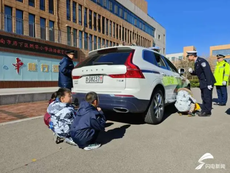 “知危險,會避險”,民警專門設計的車輛盲區(qū)體驗課。在車輛停止的情況下,讓一組小朋友躲在車輛盲區(qū),讓另一組小朋友在駕駛室觀察,“識別盲區(qū),保證安全”,讓師生共同體驗車輛盲區(qū)位置,避免危險的發(fā)生,保證交通安全。通過交通安全宣傳進校園活動,為在校師生上了一堂生動活潑的交通安全課,充分展示了濟青交警的良好形象。