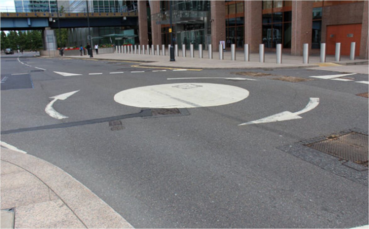對角分流島是設(shè)置在交叉口對角線上的障礙物,以阻斷直行車流。其優(yōu)點是:不需要封閉街道,只需要改變現(xiàn)有街道的方向;能保證行人和自行車通行。缺點是:需要重新改造拐彎處的路緣,造價可能比較高;內(nèi)部和救援車有時需要繞行。