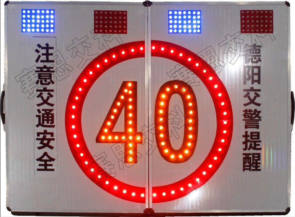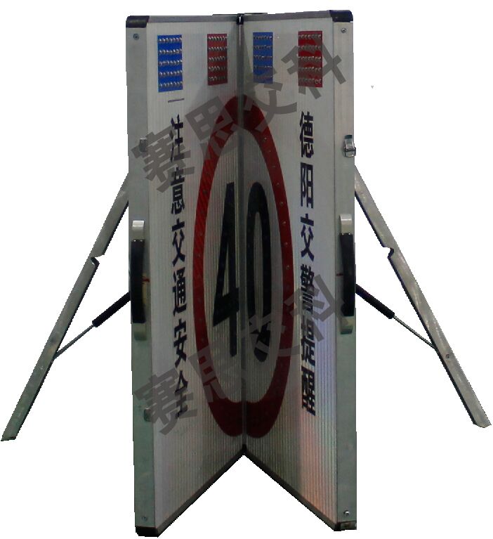 2、標志版面設(shè)置LED發(fā)光限速標志圖案,上置2組(紅爆閃燈+藍爆閃燈),兩邊設(shè)置交通警示標語或管制單位。標志整體展開后,配置支撐架,放置于管理路段,標志閉合時,配有手提把,警員可輕松提攜,方便、便攜。